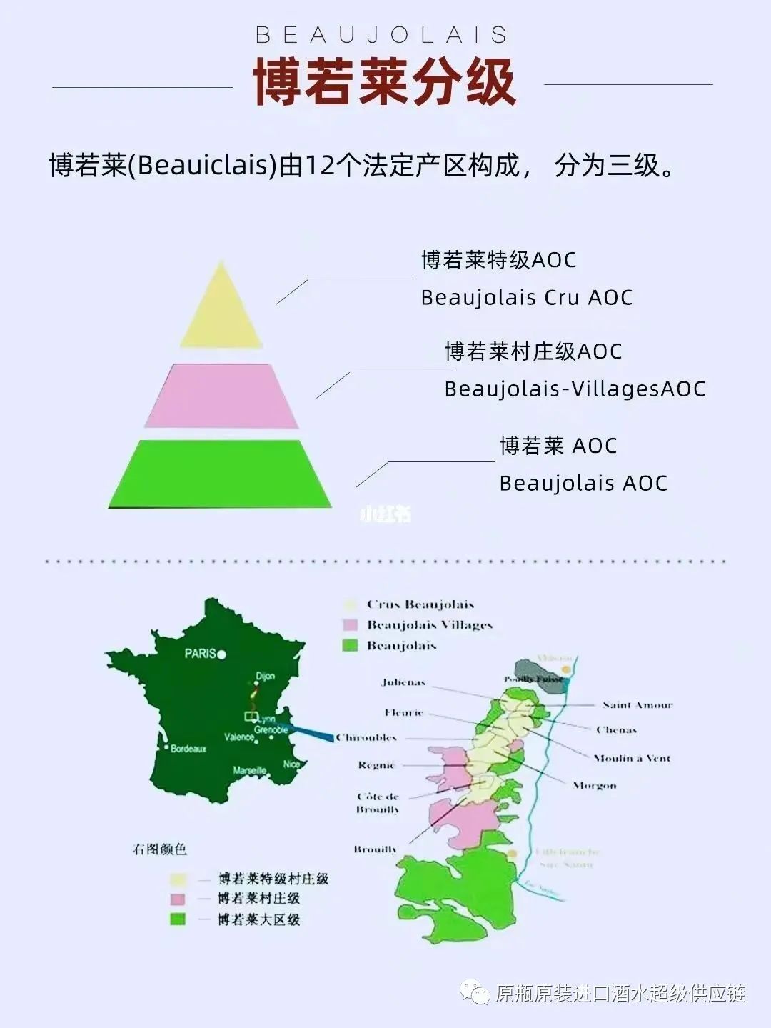 分为博若莱大区级(Beauiolais)、博若莱村庄级(Beauiolais-Villages)和博若莱特级村庄级(Beaujolais Cru)