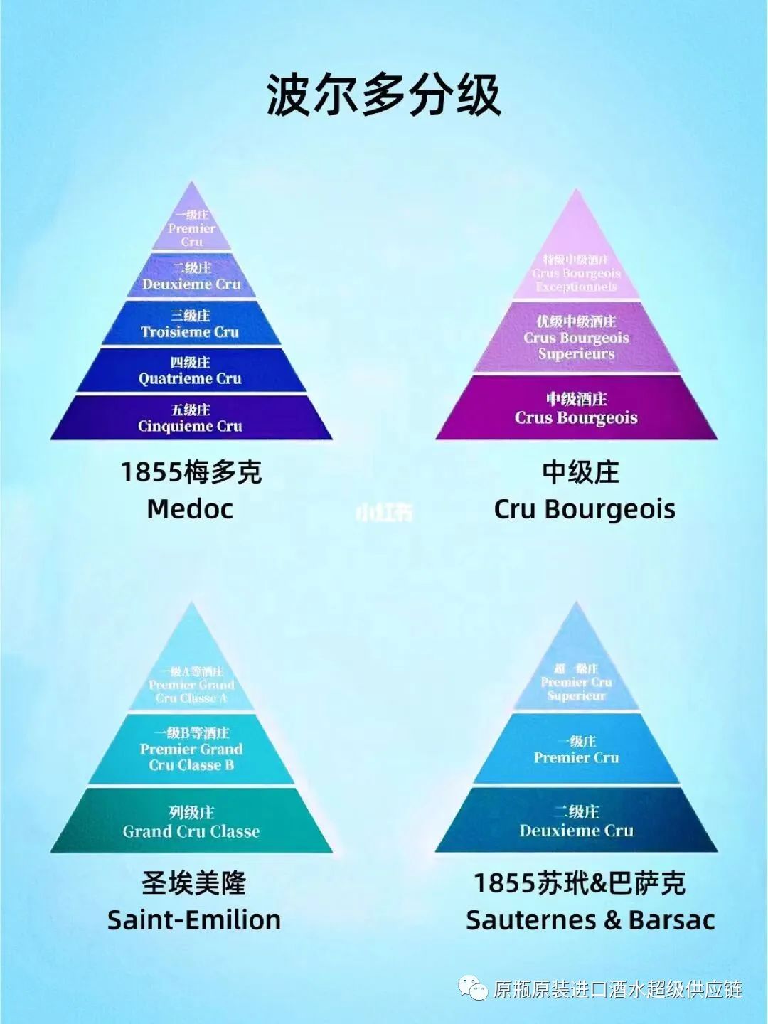 波尔多葡萄酒分级以酒庄为单位。除了广为人知的1855梅多克(Medoc)分级外,波尔多还有中级庄(Cru Bourgeois)分级、圣埃美隆(Saint-Emilion)分级、1855苏玳&巴萨克(Sauternes & Barsac)分级以及格拉夫(Graves)分级。