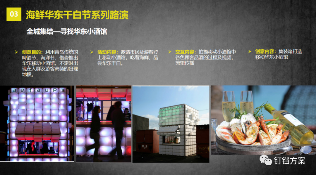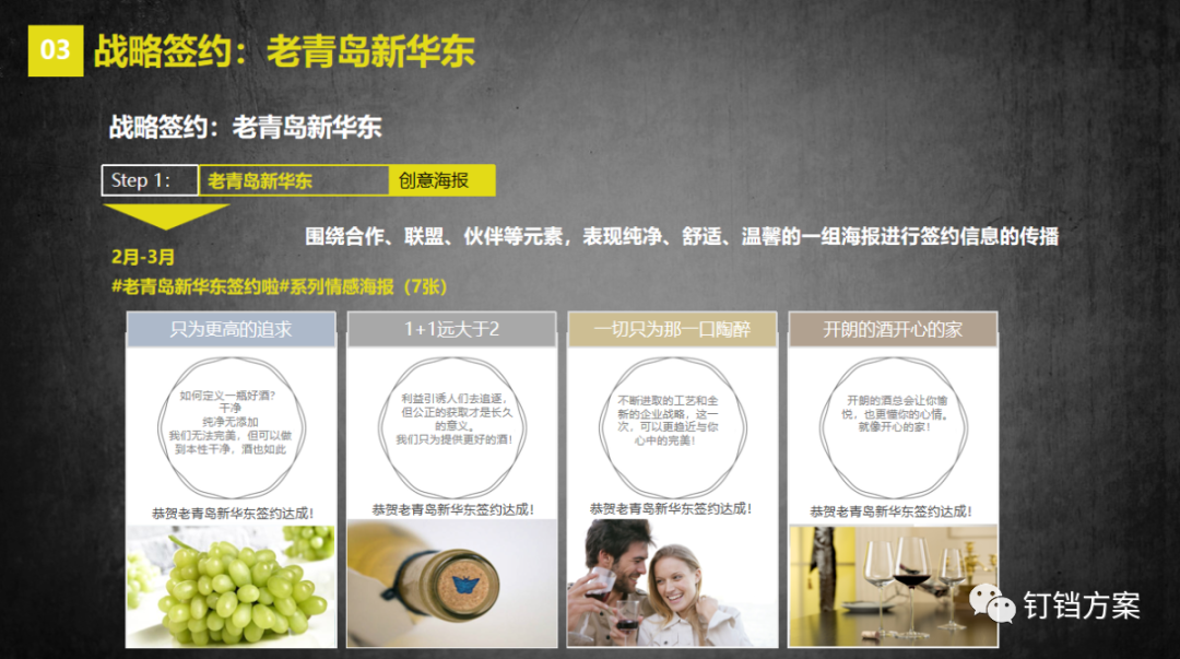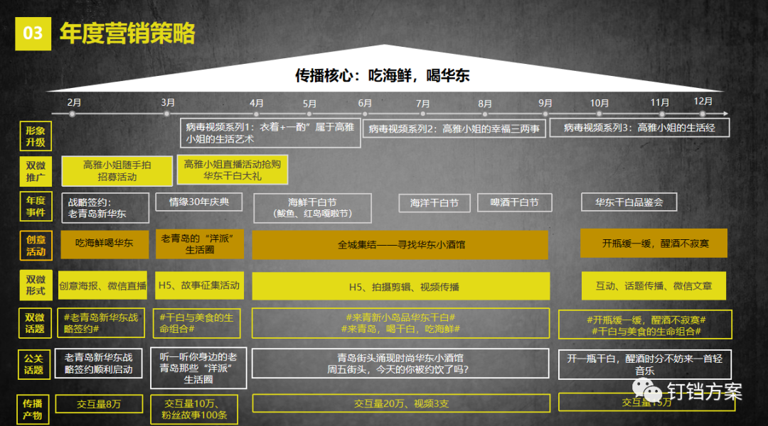 作品介绍:本方案由品牌brief回顾、三情分析、20年社会化营销策略及常规营销阶段四部分核心内容组成,通过对历史品牌回顾,市场、竞品、消费者分析,推导出华东葡萄酒品牌的策略方针,围绕“吃海鲜喝华东”的主题进行线上线下传播,达到提高品牌影响力,扩张宣传的目的
