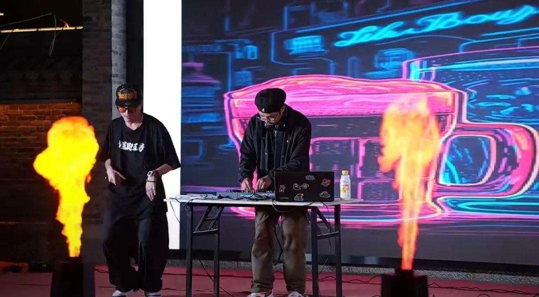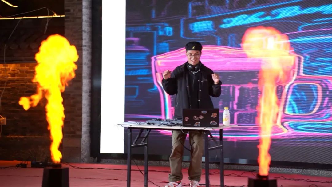 舞台周围布置的科技焰火随着音乐的节奏喷涌而出,伴着现场观众的阵阵欢呼,全然是一片火热的氛围。DJ台下还摆放了科技篝火,让这场蹦迪更加有我们本土的氛围,在篝火旁举起手和闪光灯尽情蹦迪!
