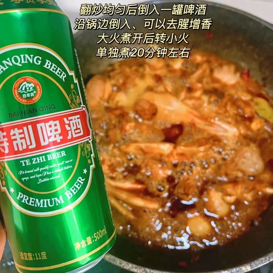 翻炒均匀后沿锅边倒入一罐青岛啤酒