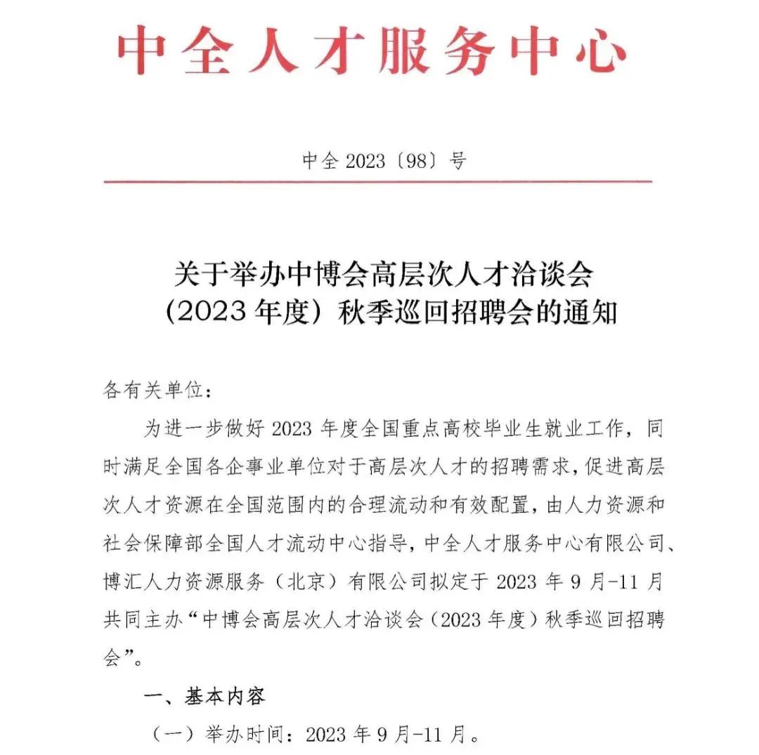 由人力资源和社会保障部全国人才流动中心指导,中全人才、博汇人力资源服务(北京)有限公司共同主办的“中博会高层次人才洽谈会(2023年度)秋季线下巡回招聘会——中南大学硕博专场”将于2023年9月16日上午在中南大学本部校区三五食堂四楼立功厅举办。