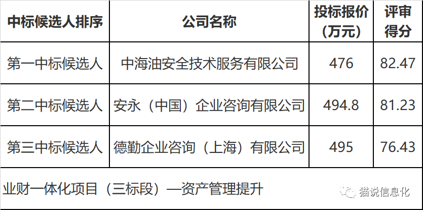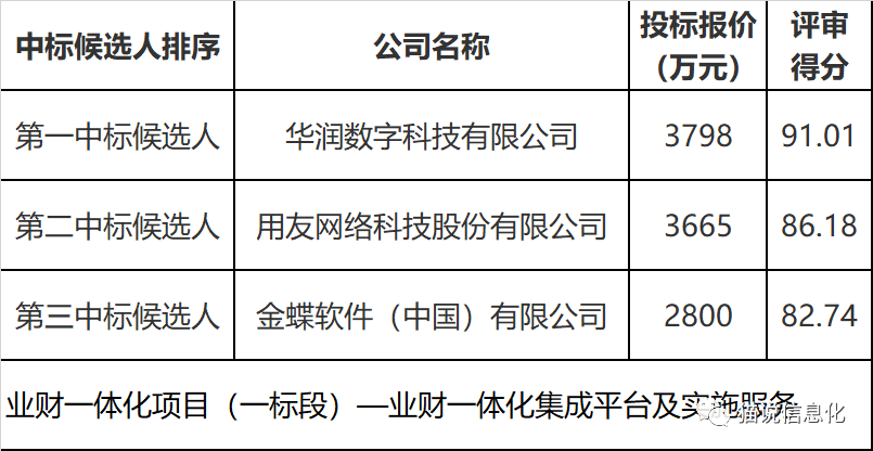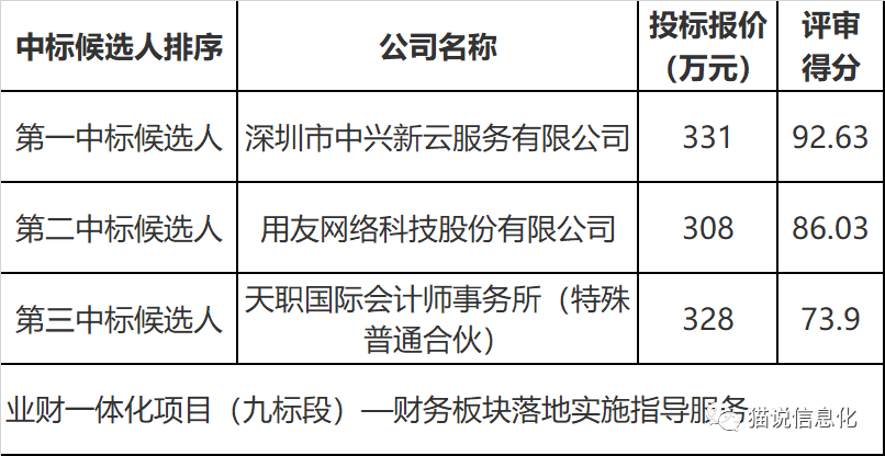 今年4月,贵州茅台酒股份有限公司启动了业财一体化项目的公开招标工作,5月开标,项目共分为9个标段(子项目),包括:1个系统集成项目,2个服务项目,6个应用系统建设项目(涉及的具体应用系统更多)。以第一中标候选人的投标报价计算,项目总金额约1.29亿元。从招标公告和中标候选人公示信息中可以了解该项目的大致情况,以及行业主流厂商参与项目投标的情况。其中,除2个服务类项目之外,其他标段均要求投标人具有有效期内的CMMI软件能力成熟度3级(及以上)等级认证证书。1. 业财一体化项目(一标段)—业财一体化集成平台及实施服务招标范围:贵州茅台酒股份有限公司及其下属分子公司,定制开发业财中台、ESB、BPM平台,以及集成实施和PMO项目管理服务。服务范围包括:预算管理、核算系统、税务系统、全业务报账系统、资金系统、电子影像系统、电子会计档案系统、商旅系统、人力资源系统、智慧法务系统和资产管理系统,即以该项目定制化开发的业财中台、ESB、BPM平台完成对上述应用系统的集成。招标范围:主要包含组织与岗职管理、人员信息管理、考勤假期、薪酬管理、人力资源门户、移动端、绩效管理、招聘、人才发展、培训管理、干部管理、管理驾驶舱、智能应用、共享运营、流程管理等模块,并实现人力资源系统与业财一体化系统进行接口对接,实现薪酬明细数据的同步。招标范围:股份公司及分、子公司的实物资产管理体系建设、资产清查及配合资产管理系统建设。招标范围:本项目为股份公司及其分、子公司打造集资产实物管理、价值管理、知识管理于一体,纵向贯通资产投资规划、资产获得、资产运营、资产处置全生命周期管理流程,横向覆盖设备设施、房屋建筑物、存货、家具用具等全量实物资产的统一运营和管控平台。5. 业财一体化项目(五标段)— 智慧法务系统建设招标范围:涵盖法务管理事项,包括合同全生命管理、纠纷案件管理、风险与合规管理、综合法律事务管理等。6. 业财一体化项目(六标段)—财务核算、预算、税务系统建设招标范围:建设预算管理系统、财务核算系统、税务管理系统。7. 业财一体化项目(七标段)—全业务报账系统、电子影像系统、电子会计档案管理系统、商旅系统建设招标范围:全业务报账系统、电子影像系统、电子会计档案管理系统、商旅系统建设。9. 业财一体化项目(九标段)—财务板块落地实施指导服务招标范围:财务板块落地实施指导服务,落地实施指导服务在茅台《业财一体化总体实施规划方案》指导下,对各系统的建设需求、实施方案、蓝图设计等进行评审、把关、指导,全程参与和指导各环节工作,确保各项目建设达到总体规划效果。配合PMO开展建设进度管控、质量管控、文档管理、沟通协同、阶段汇报、相关培训等工作。长按图片识别二维码加入信创焦点交流群