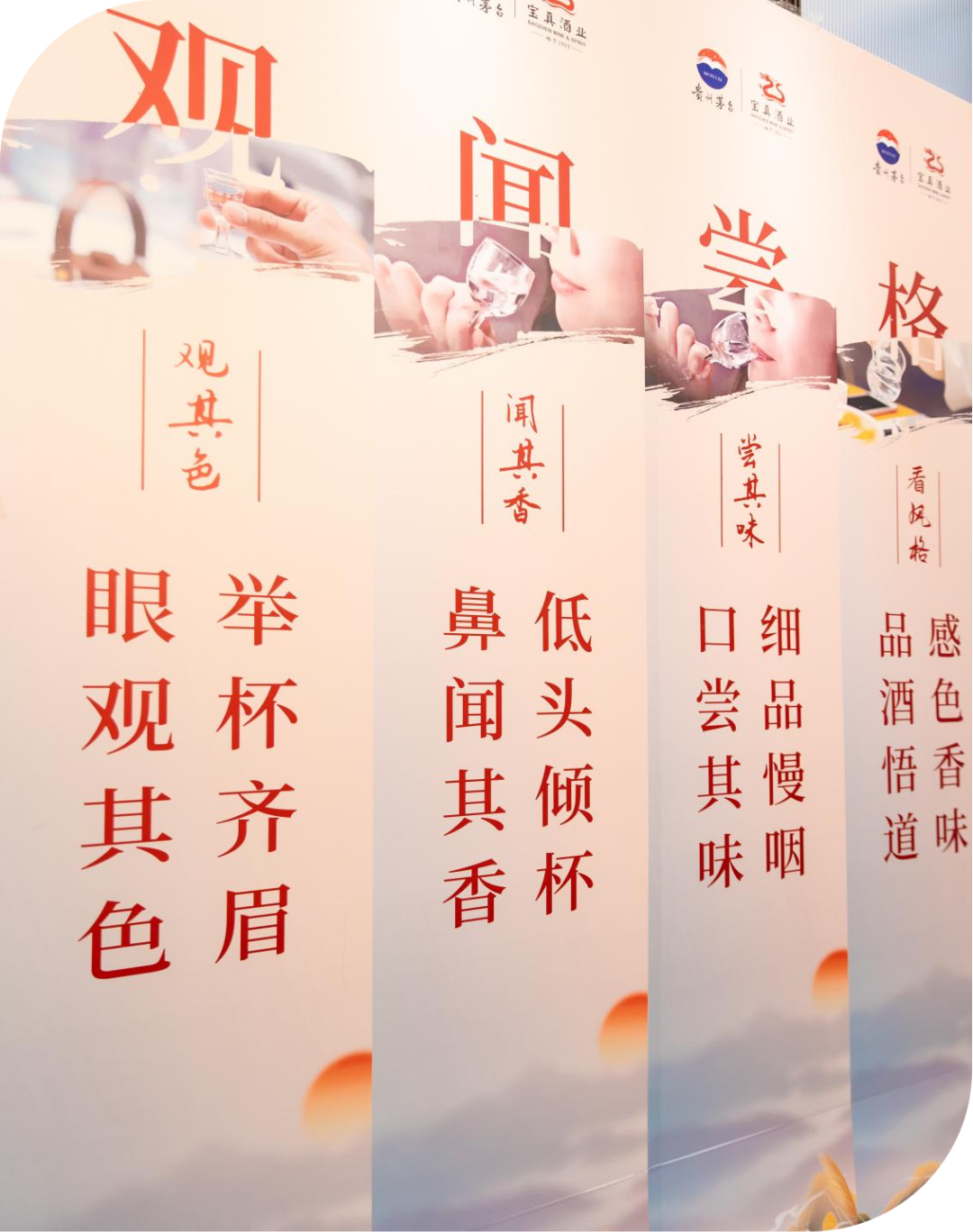 在讲师的带领下,按照“观、闻、尝、格”四式品鉴法,共同品味陈年贵州茅台酒(15)与53度新飞天茅台的风格特色。