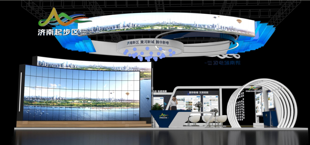 据悉,起步区展位面积约180㎡,以“济南新区 黄河新城 鹊华新卷”为主题,设计序言,“黄河战略、泉新未来”,“动能转换、园区引擎”,“鹊华新卷、文旅赋能”,“投资热土、机遇无限”,“鹊华秋色、身临其境(VR体验)”,“非遗手造、文化传承”等区域,全面进行起步区未来新城愿景展示、重点园区、项目招商推介及黄河鹊华文化体验。