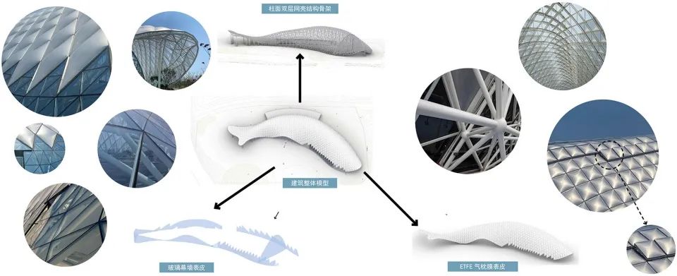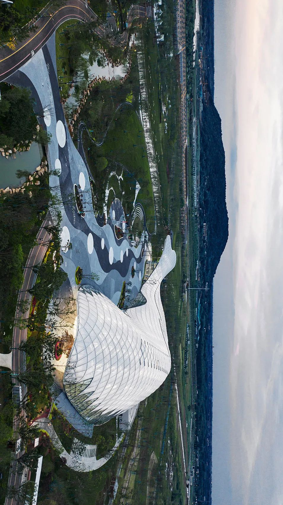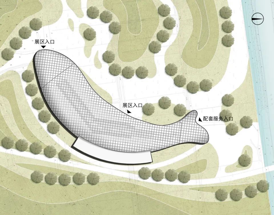 设计的主体立意源自长江中的“大熊猫”——江豚,通过模仿生物形态化的语言,将江海文化表现的淋漓尽致。总体布局遵循“虚实相生,内外一体”的思想,建筑造型喻意“江豚游弋”,是对地域与文化特征的概况提炼,以形表意,融于自然。外部景观设计中以海浪形态的铺装、飘摇水草形态的遮阴构筑、鱼形景观铺装及小品渲染烘托江海之恋的设计主题,最终呈现以江海文化为主要特色的整体景观风貌。表现出生态绿色,融入自然的整体形象,突显自然、人文、生态的主题。