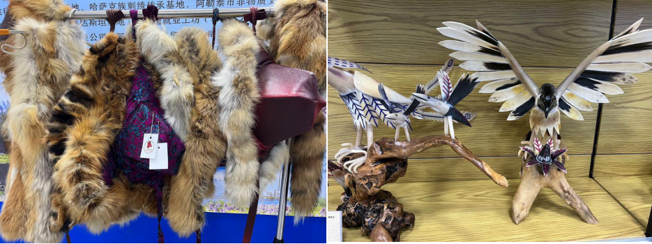 展厅外循环播放着阿勒泰地区非遗保护工作宣传片,展厅内的陈列体现了本地深厚的艺术底蕴,为冬博会增添非遗魅力。非遗文化传承人身着盛装,为大家介绍着非遗展品的传统技艺,观众们亲眼目睹了马皮滑雪板制作技艺、花毡制作技艺、乳制品制作技艺、皮革编织技艺、木制器具加工技艺、牛角加工技艺等非物质文化遗产项目。