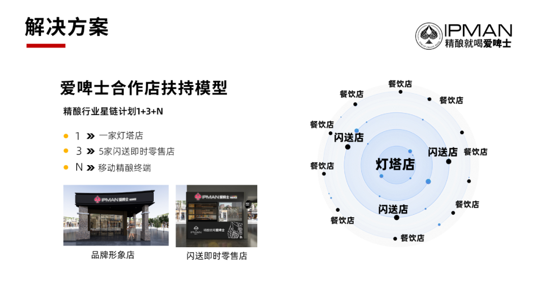 在消费者触达上,精酿行业有一部厂家实现了“前半段”,即通过小酒馆触达消费者;也有一部分厂家实现了“后半段”,即通过终端渠道铺设市场。而爱啤士构建了“1+3+n”的BC一体化模型,即“一家灯塔店、三家闪送即时零售店、N个移动精酿终端”,既打造品牌自己的连锁酒馆体系,同时也深度覆盖餐饮、终端等主要消费场景,通过整个连锁运营体系的完善,实现目标用户、经营业态、获客方式、连锁化、盈利模式等一系列商业模型的构建,充分赋能合作伙伴,并沉淀更多的用户和品牌资产。