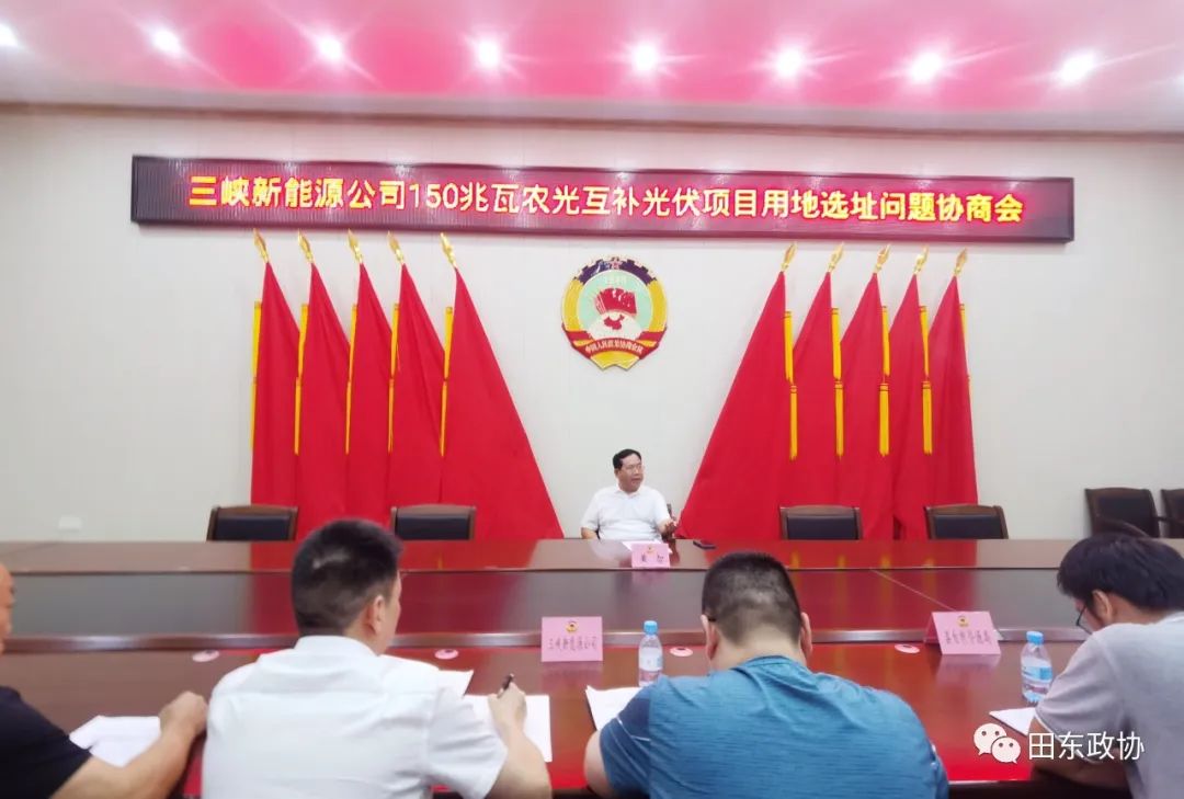为顺利推进三峡新能源公司150兆瓦农光互补光伏项目,实现项目在今年11月顺利开工建设目标,9月11日下午,田东县政协副主席黄智主持召开三峡新能源公司150兆瓦农光互补光伏项目用地选址问题协商会,县自然资源局、发改局等县直有关职能部门和祥周镇、三峡集团新能源公司广西分公司相关领导参加协商会。