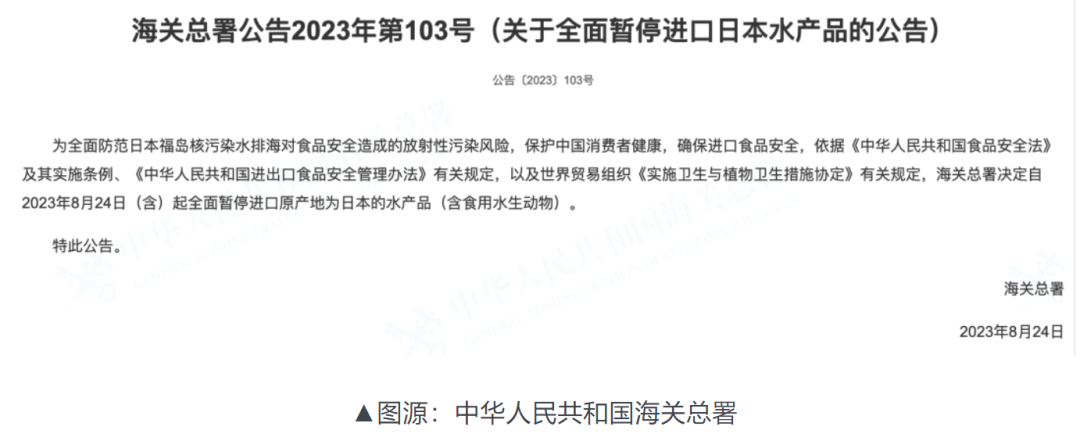 为确保食品安全,全面防范日本福岛核污染水排海可能对中国消费者健康造成的放射性污染风险,中国海关总署已发布关于全面暂停进口日本水产品的公告。该公告自2023年8月24日起生效,将全面暂停进口原产地为日本的水产品,包括食用水生动物。
