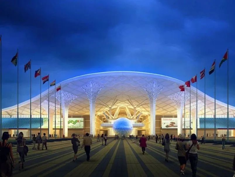 展馆采用长条形“鱼骨式”布局,一条南北向、长1.75公里的双层中央廊道连接所有的登录大厅、展厅、会议区以及餐饮区域。