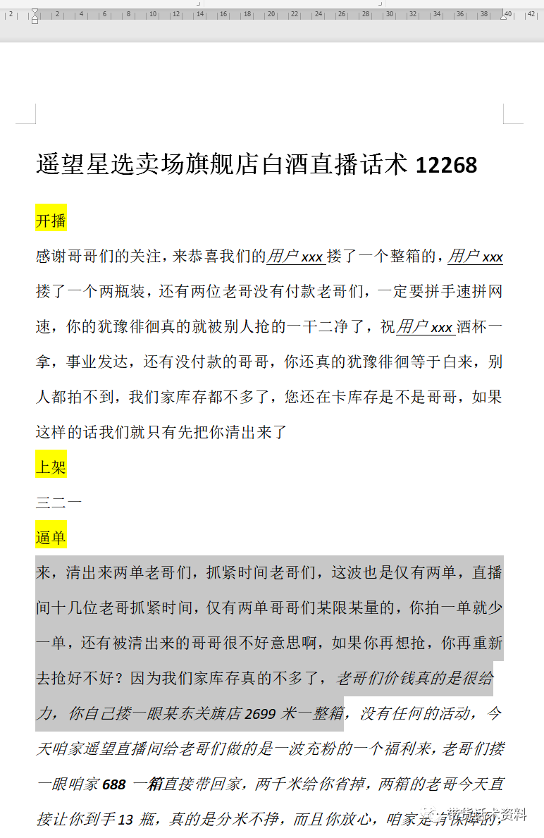 话术简介:包括了贵州平坝酒,重点是原价2699米一箱的,今天直播间只需要688米一箱,而且拍两箱还多赠送一瓶,有助播,是单品,是完整的直播话术,从开播到下播。