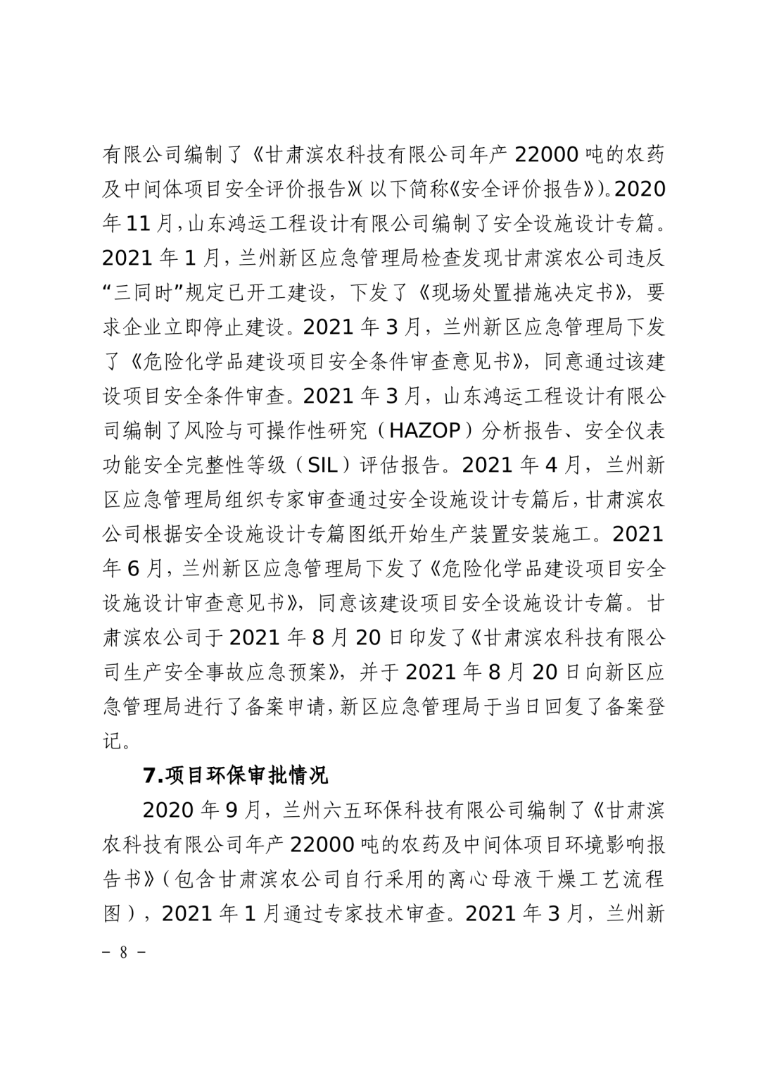 事故调查报告显示,甘肃滨农科技公司总经理、环保治理部主任和生产安全部副主任等8人因对事故负有直接责任,涉嫌刑事犯罪,建议被移送司法机关处理。