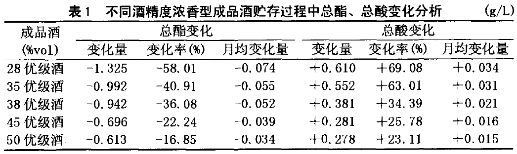 浓香型白酒贮存过程中口感质量的变化是内在质量变化的感官反映,内在质量的变化综合地表现为贮存前后总酯、总酸的变化。分析和研究浓香型白酒在贮存过程中总酯、总酸的变化就能够大体看清白酒品质变化的程度。在本文中,对浓香型白酒贮存过程中总酯、总酸的变化结果进行分析,以找出浓香型白酒贮存过程中内在质量变化的趋势。收集不同酒精度、不同档次的浓香型成品酒、原度和相应降度等级酒(加浆水为纯净水),对其进行瓶装、压盖密封(与出厂酒包装条件一致),存放于室内货架上。每个品种样酒60瓶,每次实验各2瓶分别供分析和尝评用。酒精度、总酸、总酯测定:分别按GB/T10345.3—1989~10345.5—1989实验方法。检验结果精确度:符合GB/T10345—1989要求。感官评定:由浓香型白酒国家评委、省评委组成的感官评定小组按GB/T10345.2—1989感官评定方法对试验样酒进行口感质量判定。2 实验结果