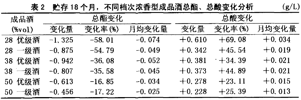 以不同酒精度优级酒贮存18个月总酯、总酸变化结果加以说明(见表1)。浓香型白酒贮存过程中,酒精度越低,总酯减少量越多,总酸增加量越多,变化速度越快;酒精度越高,总酯减少量越少,总酸增加量越少,变化速度越慢。如:贮存l8个月,35%vol优级酒总酯减少率分别是45%vol、50%vol优级酒的1.8倍、2.4倍;总酸增加率则分别45%vol、50%vol优级酒的2.4倍、2.7倍。中、低度浓香型白酒中,酯的含量本身就低于高度浓香型白酒,加之在贮存过程中,总酯减少速度以及总酸增加速度又比高度白酒快,所以,中、低度白酒内在质量、口感质量变化速度较快,高度白酒的变化速度相对较慢。