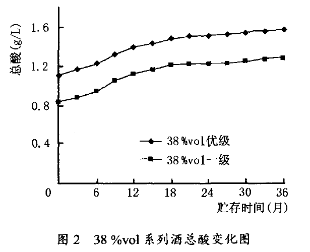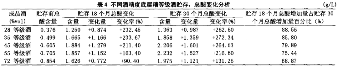 当白酒贮存18个月时,28%vol、35%vol、45%vol、55%vol、72%vol等级酒的总酸变化量(g/L)分别为:232.45、233.67、211.40、163.40、90.40。35%vol等级酒总酸增加率分别是45%vol、55%vol、72%vol等级酒的1.1倍、1.4倍、2.6倍。从总酸变化率来看,低度酒总酸变化率比高度酒大。中、低度等级酒总酸增加以贮存前期增加速度较快。如:28%vol等级酒贮存l8个月总酸增加量占贮存30个月总酯减少量的88.55%;35%vol等级酒贮存l8个月总酸增加量占贮存30个月总酯减少量的85.80%。而高度酒贮存前期总酸增加速度相对缓慢一些,但与其整个贮存过程变化量相比,仍然较快。3 讨论
