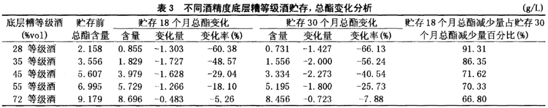 不同酒精度的等级酒在贮存过程中,总酯减少的特点为:酒精度越高,总酯减少量越少,减少速度越慢;酒精度越低,总酯减少量越高,减少速度越快。原度等级酒的总酯减少量最小,减少速度最慢。所以,等级酒在贮存过程中最好为原度贮存,避免降度酒贮存后香味成分的大量损失。