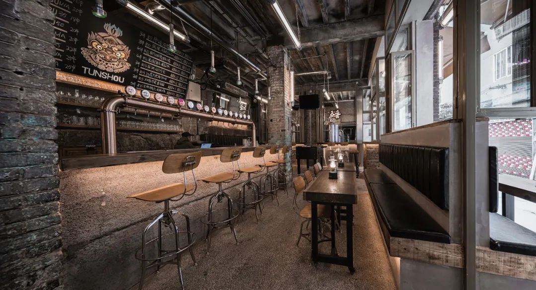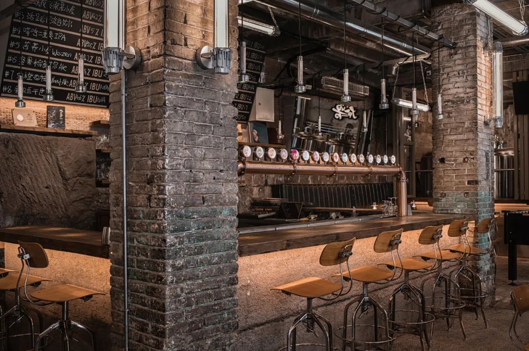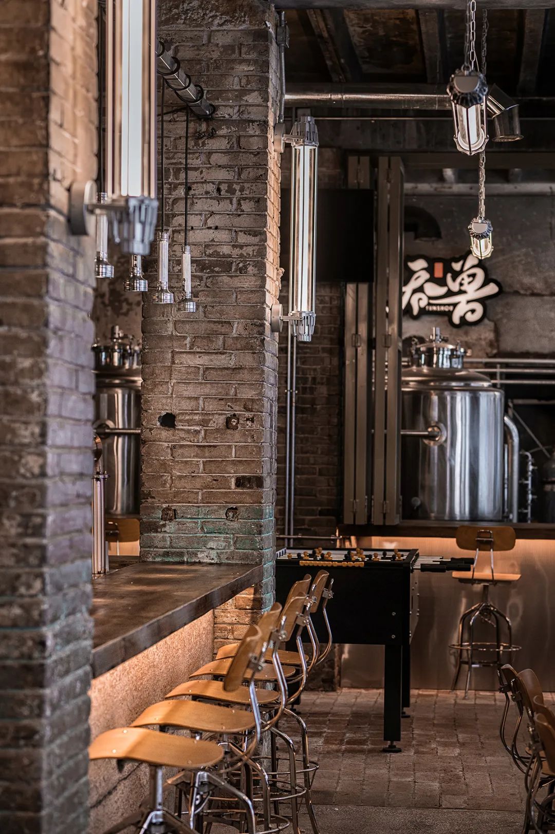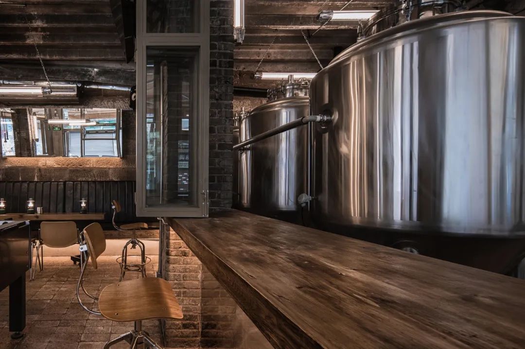 鉴于整个场地长条形。我们设定了以吧台为中心的结构,所有的活动及座位围绕着吧台进行,精酿啤酒的发酵机正好符合设计的工业设定,我们把其设置在比较显眼的位置,用玻璃分割,使其可视化,以彰显主题特点。