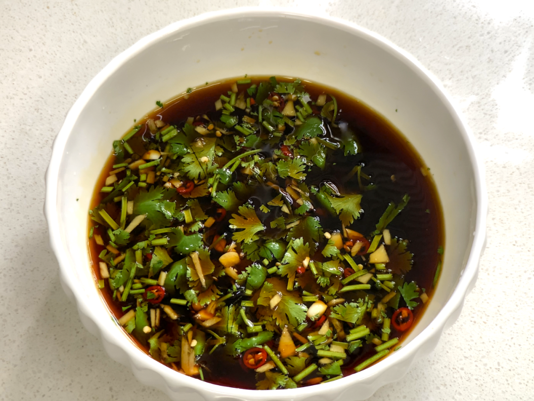 步骤2:然后调一碗生腌汁:蒜末、香菜、姜、辣椒和柠檬切好放碗里。加一碗鱼露、一碗酱油和2勺白糖,再加100毫升的矿泉水搅拌均匀。这个生腌汁可以腌一切海鲜,鱼、虾、蟹、螺、八爪鱼等等。