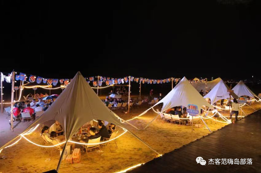 讲真这次活动天公是没作美的。早上顶着淅沥的小雨,中粮酒业活动筹备组的人员就开始布场,随着展板海报、路牌、彩旗等陆续到场,让杰客范嗨岛部落这片习惯于夜晚闪现的海滩,白天也充满了灵动、光鲜的色彩。雨一直下,虽时断时续、时紧时停,天却一直阴沉,让承接这次活动的我们无比揪心,一天刷了无数遍天气预报。店长波波在群里说:“昨夜夜观天象,掐指一算,七点十五分28秒停雨”,算是给了大家一点莫名其妙的心里寄托。晚19:00,雨稍事休息,华灯初上,乌云压顶下,更显示出海口湾畔的独特风韵之美。参加活动的人员陆续到场,先来者暂居帐篷,后来者落座中场。烤全羊、霸王签烤肉、乐队陆续登场,合影、举杯,欢声笑语下,中粮酒业及其经销商达人们很快就忘记了小雨的存在,进入酣畅淋漓的分享时光。精彩频现,回味悠长。