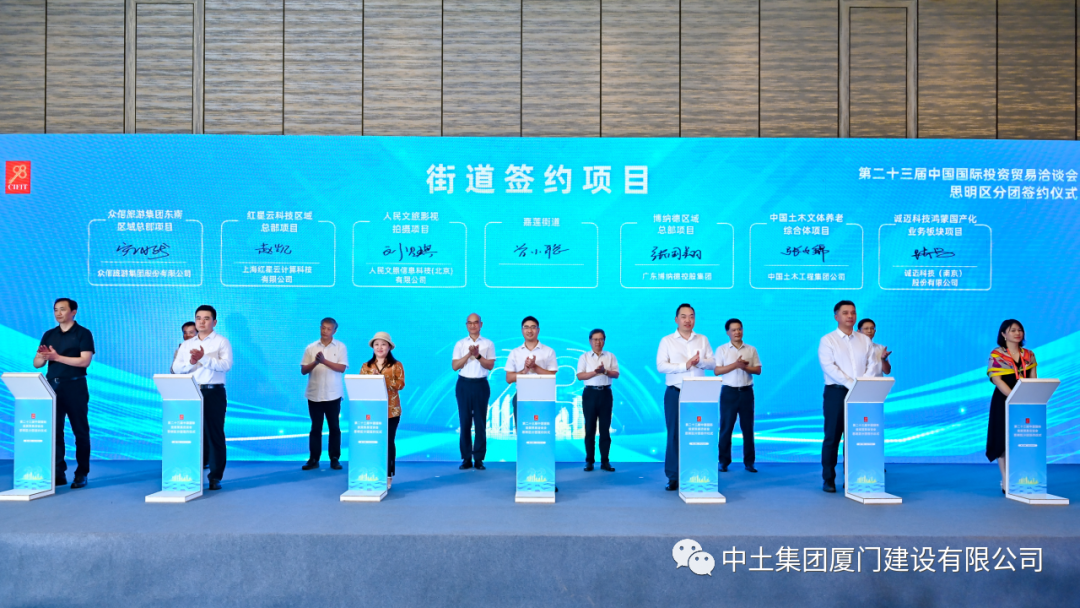 9月8日下午,张文锦参加了第二十三届国际投洽会思明区分团签约仪式,代表集团公司与思明区签署了中国土木文体养老综合体项目意向协议,为项目顺利推进奠定良好合作基础,中国土木将在全产业链优势之上贡献力量,为厦门市建设现代化教育强市、高水平健康城市助力。