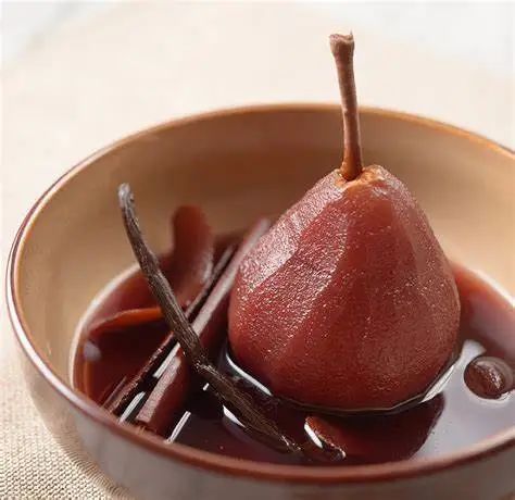 葡萄酒与水果的经典搭配——红酒炖雪梨,红酒的醇厚与雪梨的清甜相互交融,口感酥软可口,这也是一道圣诞节热门甜点。