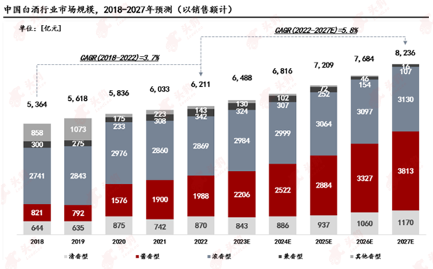 中国白酒行业市场规模从2018年起稳定上涨,从5,364亿元增长到2022年6,211亿元,年复合增长率为3.7%。中国白酒行业预计至2027年市场规模将会增长至8,236亿元,未来五年的年复合增长率预计为5.8%。