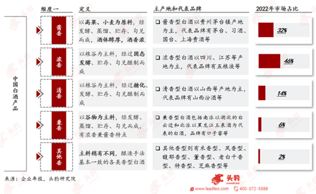白酒是一种以高粱、玉米、小麦、大米、红薯等为主要原料,经过多次蒸馏、发酵而成的酒类。根据原料、工艺、香型等因素,白酒可以分为多个子类,如酱香型、浓香型、清香型、兼香型等。上述白酒品类中市场占比最高的是浓香型白酒,市占率上涨较快的是酱香型白酒和清香型白酒。