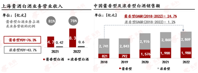 从年复合增长率(CAGR)来看, 2018年至2022年之间酱香型白酒的CAGR为24.7%,而白酒行业整体市场仅为3.7%。