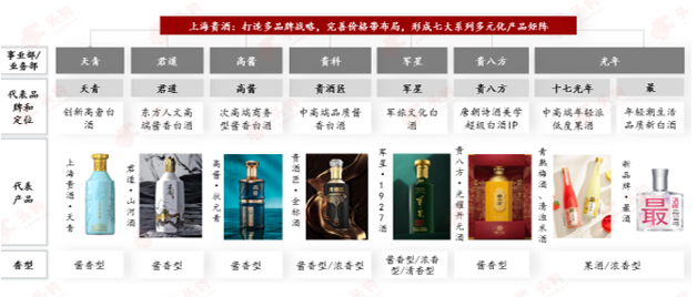 上海贵酒产品系列主要包括“天青” “君道”“高酱”“贵酒匠”“军星” “贵八方”及“十七光年”七大系列,包含了白酒和果酒两类产品,产品一一对应品牌细分定位。公司坚持聚焦酱酒主赛道的同时,通过差异化市场竞争,以多品牌、多香型,切入多个细分市场,产品体系日趋完善。