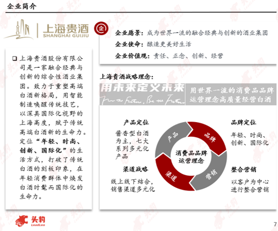 上海贵酒股份有限公司是一家融合经典与创新的综合性酒业集团,公司立足于上海、布局全国、面向世界、引领行业创新发展。以消费者需求为中心,以数字化为突破口,以科技赋能、创新营销、创业平台为业务重点,走出行业差异化路线 ,旨在通过年轻化的营销模式,结合上海特有的文化底蕴,赋予上海品牌新的生机,打造出“上海新名片”。