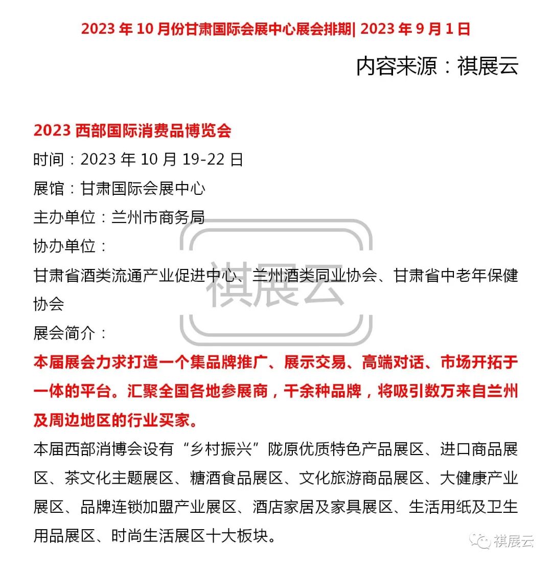 2023年10月份甘肃国际会展中心展会排期| 2023年9月1日