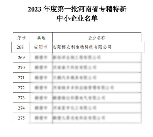 近日,河南省工业和信息化厅发布了2023年第一批“专精特新”企业名单。凭借在畜牧行业的专精程度、产品和技术创新能力及综合发展实力的市场表现,安阳博农利生物科技有限公司荣获河南省“专精特新”企业认定。