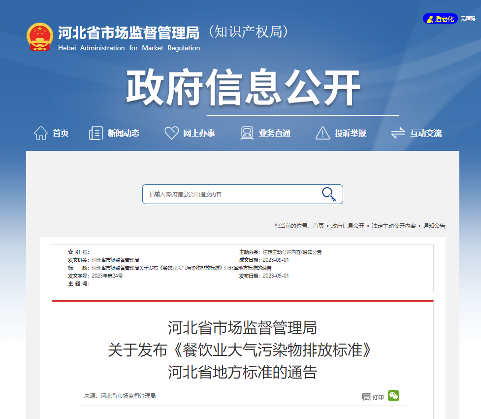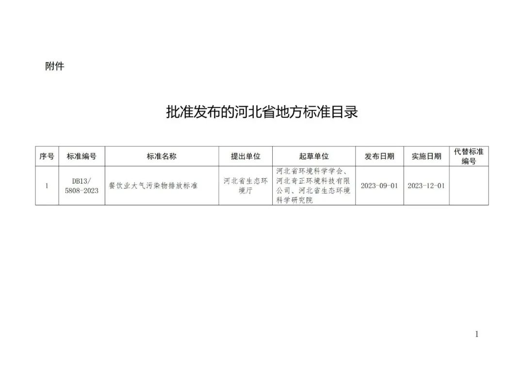 经河北省人民政府批准,河北省市场监督管理局会同河北省生态环境厅于9月1日联合发布了《餐饮业大气污染物排放标准》强制性河北省地方标准,现予以通告(详细目录见附件)。