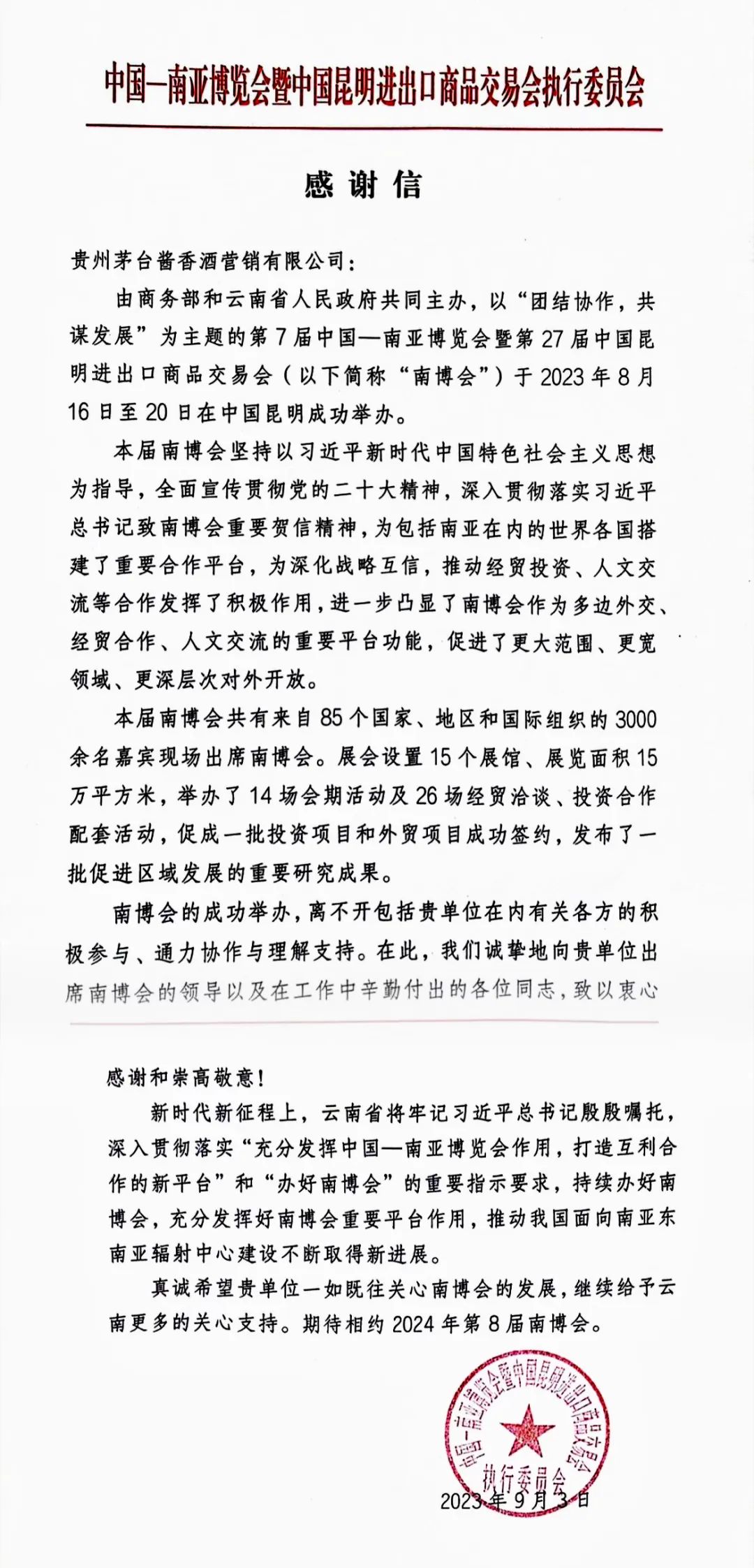 9月13日,贵州茅台酱香酒营销有限公司收到来自中国—南亚博览会暨中国昆明进出口商品交易会执行委员会的感谢信,信中感谢酱香酒公司在第7届中国——南亚博览会暨第27届中国昆明进出口商品交易会(以下简称“南博会”)上的积极参与和通力合作,并向在南博会上辛勤付出的酱香酒公司的工作人员致以衷心感谢和崇高敬意!