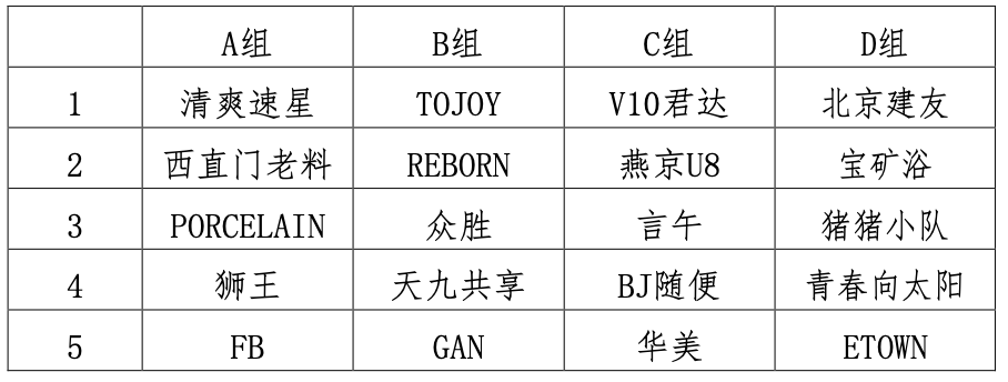参加北京市总决赛的20支队伍来自五站分站赛的各站前四名,经过重新分组抽签后,具体分组情况如下: