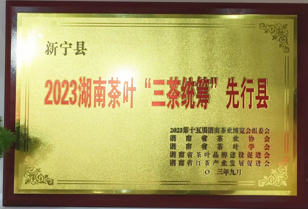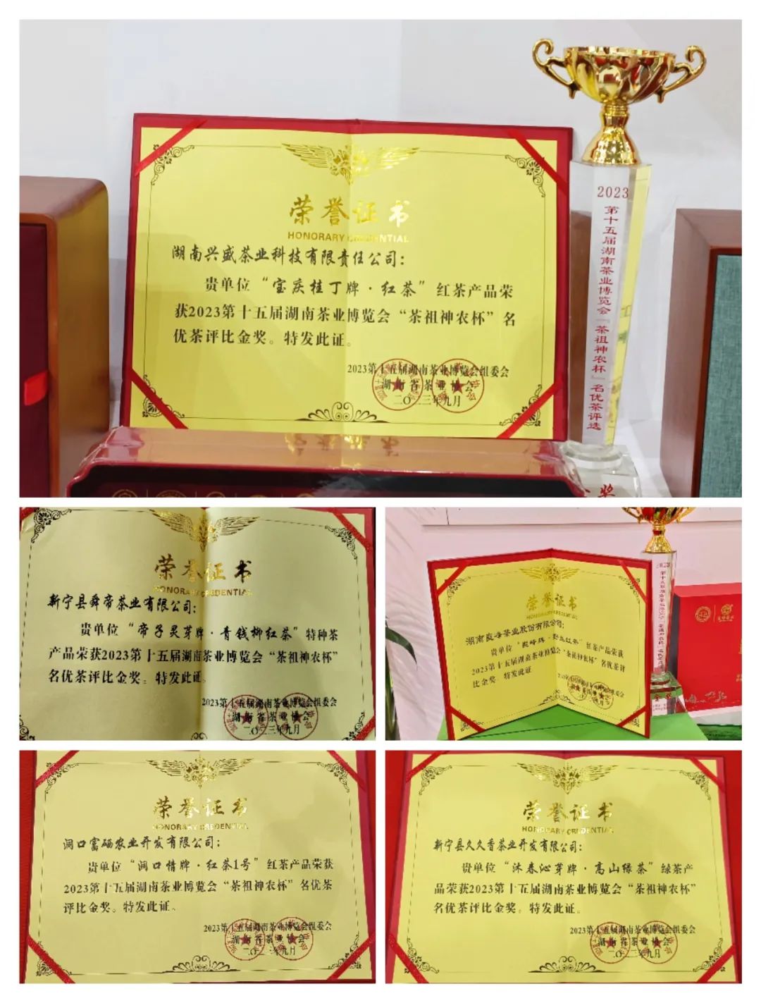 茶博会期间,对“茶三十”及“茶祖神农杯”进行了颁奖。新宁县荣获2023湖南茶叶“三茶统筹”先行县荣誉称号;新宁县久久香茶业开发有限公司选送的沐春沁芽牌高山绿茶获“茶祖神农杯”绿茶金奖,湖南崀峰茶业股份有限公司选送的峎峰牌野生红茶、湖南兴盛茶业科技有限公司选送的宝庆桂丁牌红茶、洞口富硒农业开发有限公司选送的洞口情牌红茶1号获“茶祖神农杯”红茶金奖;新宁县舜帝茶业有限公司选送的帝子灵芽牌青钱柳红茶获“茶祖神农杯”特种茶金奖。