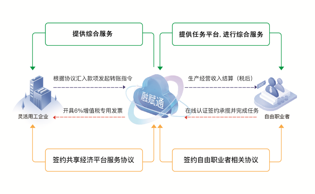 在业务合作的基础上,灵工平台与企业签订综合服务协议,并与自由职业者签署相应的电子服务合同。自由职业者在线接单,由平台发放自由职业者的经营所得,统一申报个税,并由平台为企业提供完整的结算及票税凭证。