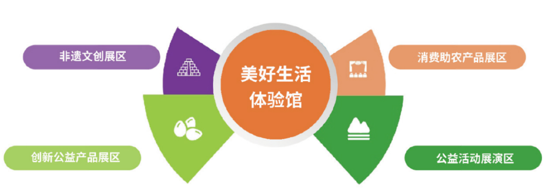 美好生活体验馆下设创新公益产品展区、消费助农产品展区、非遗文创展区和公益活动展演区,集中展示各类帮扶困弱群体的公益产品,推广各类非物质文化遗产,引导和带动更多慈善资源支持和帮扶困弱群体,也为公众提供近距离参与公益、体验公益的机会。