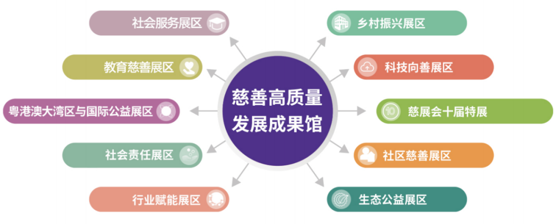 慈善高质量发展成果馆下设社会服务展区、科技向善展区、社区慈善展区、乡村振兴展区、教育慈善展区、生态公益展区、社会责任展区、行业赋能展区、粤港澳大湾区与国际公益展区以及慈展会十届特展十大主题展区,集中展示慈善行业最新发展成果以及社会力量参与解决民生问题、助推高质量发展的突出成效。