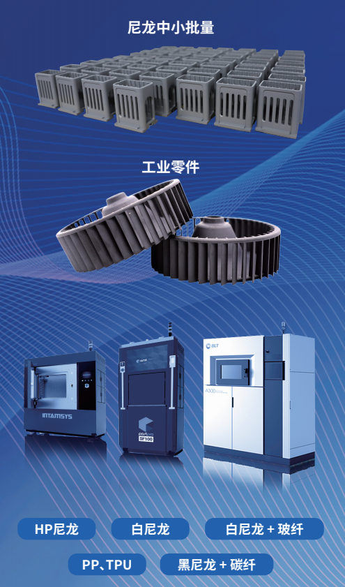 打印材料包含树脂、尼龙、全彩、金属、红蜡、FDM、TPU、PP等50多种