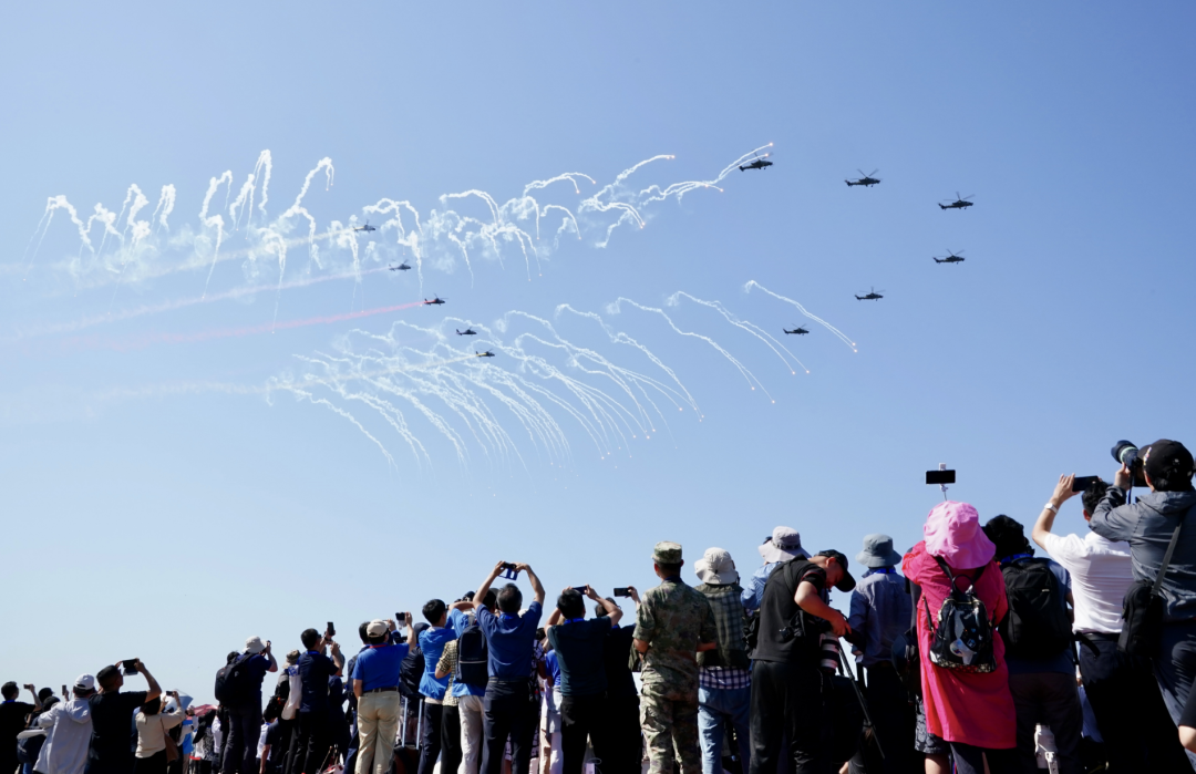 开幕式上,航空工业研制的6型18架军、民用直升机整齐出动,共舞苍穹,为现场观众带来一场专属直升机的空中视觉盛宴。陆军“风雷”表演队7架直10武装直升机、6架直19武装直升机、2架直20战术通用直升机依次带来震撼的编队、单机表演,先后向观众演示了三机芭蕾、空中队列、尾追螺旋、四机开花等8个课目的特技飞行动作,精彩绝伦的表演让现场观众掌声不断,充分展示了陆军航空兵转型建设和实战化训练成效,生动诠释了国产军用直升机优异的操纵品质和先进的战技性能。航空工业研制生产的AC352、AC312E紧随其后,先后进行编队飞行,AC311A也进行了吊桶悬挂作业演示,突出展示了航空工业AC系列民用直升机的优越综合性能,彰显了国家应急救援硬核装备的专业能力。