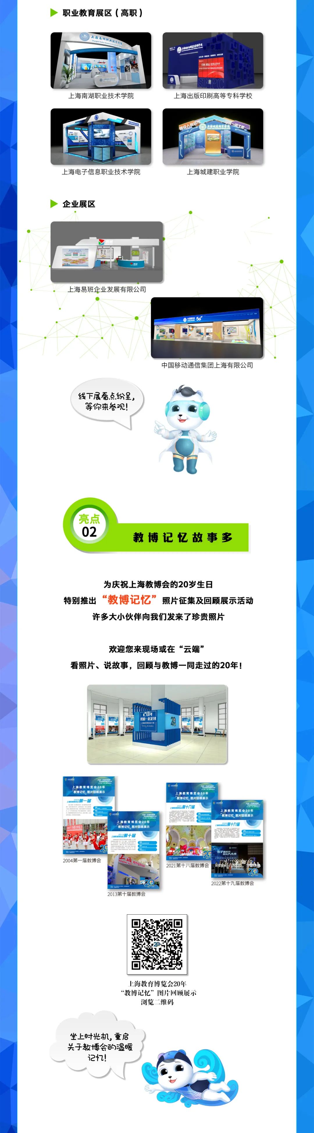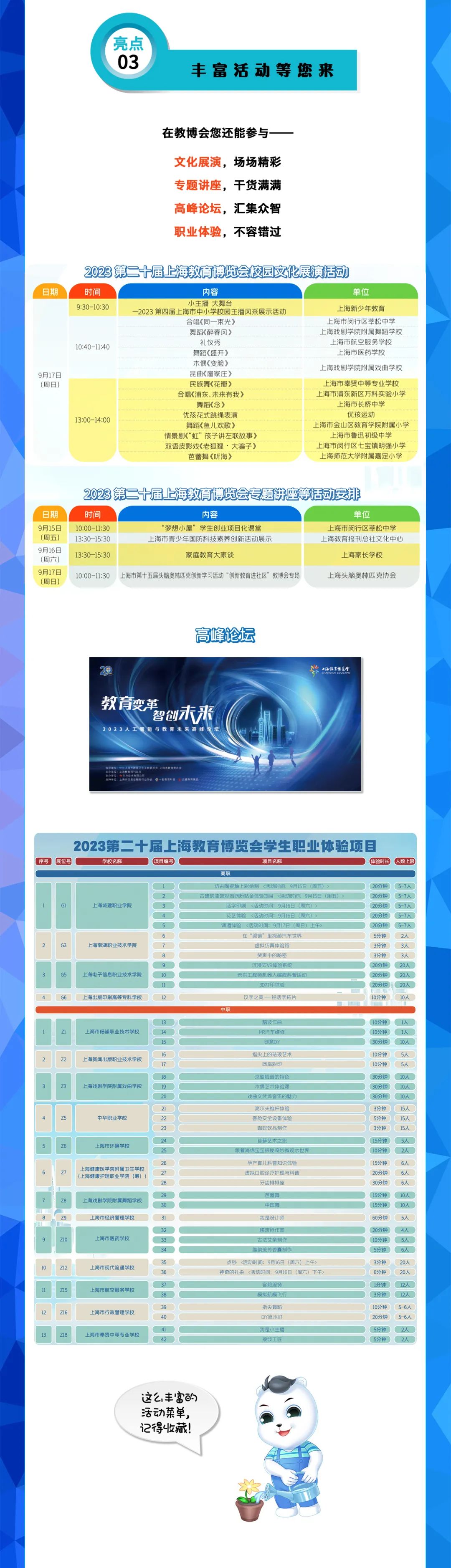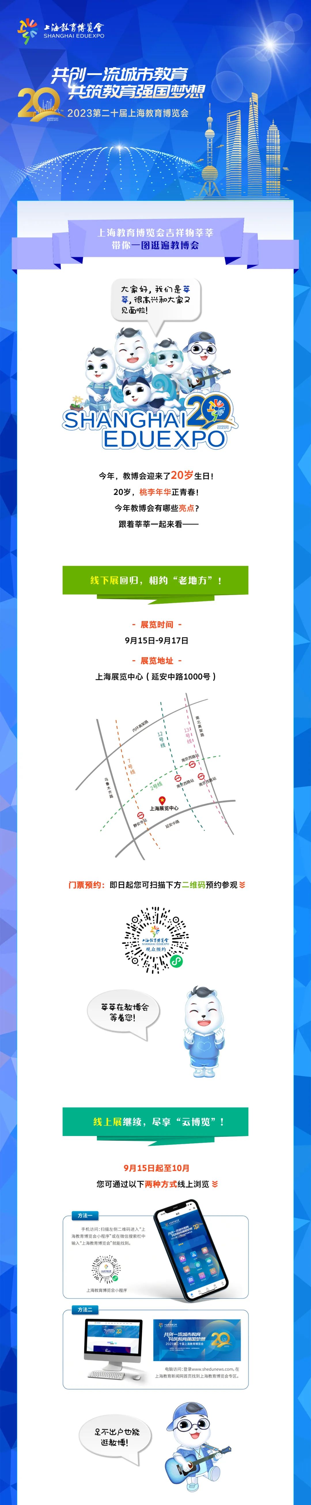 由上海市教卫工作党委、上海市教委指导,上海教育报刊总社主办的2023第二十届上海教博会以“共创一流城市教育,共筑教育强国梦想”为主题,将于9月15日在上海展览中心开幕,给您带来线上、线下为期一个多月的观展体验。其中,9月15日—9月17日为线下展,同期开展的线上展持续至10月底。