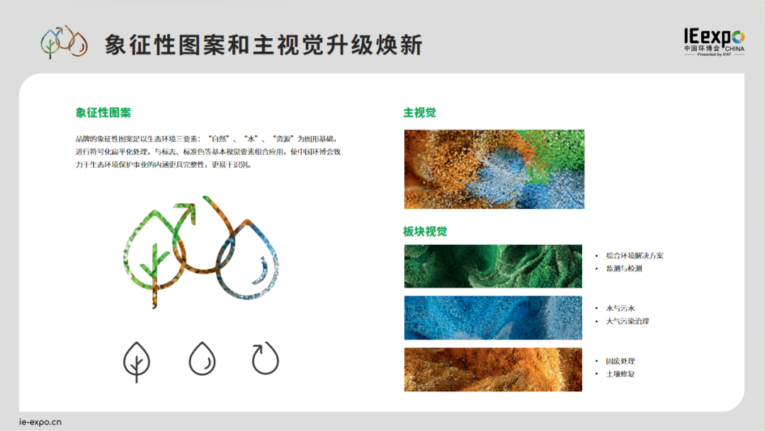 回顾中国环博会IE expo历经的品牌形象演变,不难发现每次变化都紧密关联着品牌发展的不同阶段。2014年,品牌主视觉使用互相融合的具象化环保元素,充分展现了中国环博会IE expo展示环境污染治理技术的平台属性,并一直沿用至今。而此次品牌形象升级,将象征性图案抽象化符号化,主视觉使用代表不同产业板块的粒子融合图案,则凸显了中国环博会IE expo追求极致,致力于发掘纯粹的、面向未来的环境技术的决心,以及展现了中国环博会IE expo作为旗舰平台的品牌形象和对高质量发展的承诺。