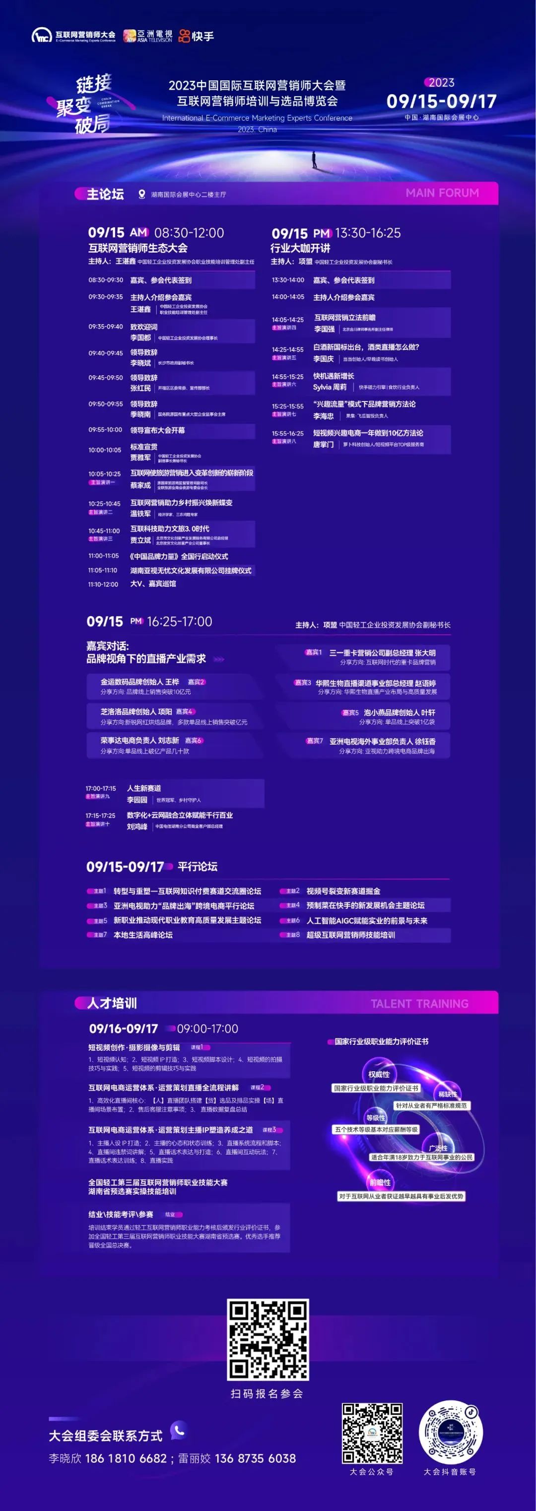 大会由长沙市开福区人民政府支持,中国轻工企业投资发展协会主办,亚洲电视控股有限公司联合主办,长沙无忧永邦会展有限公司、谊和永邦(北京)会展有限公司承办。本次大会致力于打造成为国家级互联网营销标杆,旨在实现《互联网营销师国家职业技能标准(2021年版)》的宣贯、培训与普及,促进互联网营销产业链贯通、生态圈融合,建设国家级互联网营销人才大本营,搭建世界级互联网营销精品优选库。同时,为了实现企业常态化全方位贴身落地的互联网营销服务,此次大会也将正式授牌,通过发挥湖南的内容生产优势,落户湖南省展览馆,打造国家级互联网营销产业服务中心和营销师培训中心,构建互联网营销产业生态,并形成产业集聚。大会以“链接·聚变·破局”为主题,主要呈现了以下亮点: