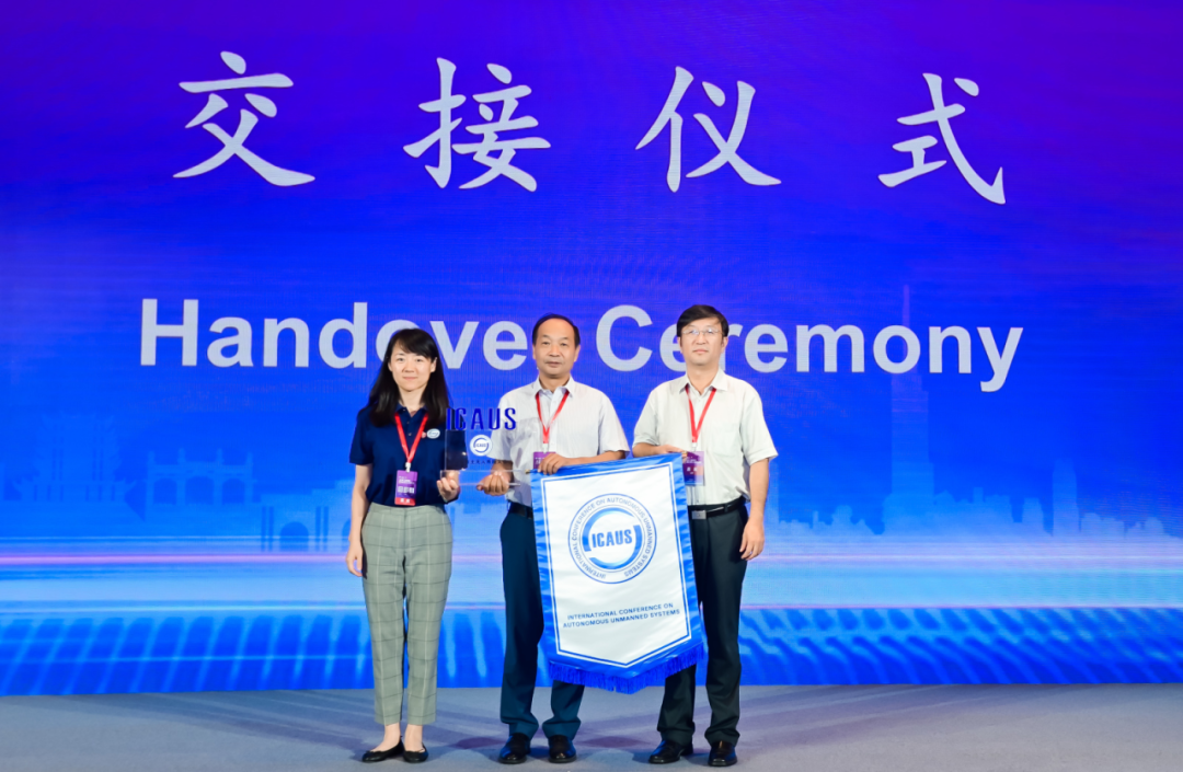 2024第四届国际自主无人系统大会由中国科学院沈阳自动化研究所申请承办。《无人系统技术》期刊编委会主任、中国航天科工飞航技术研究院李风雷总师,南京理工大学自动化学院院长杨力教授,中国科学院沈阳自动化研究所副总工程师林扬共同上台,交接会旗和会徽。