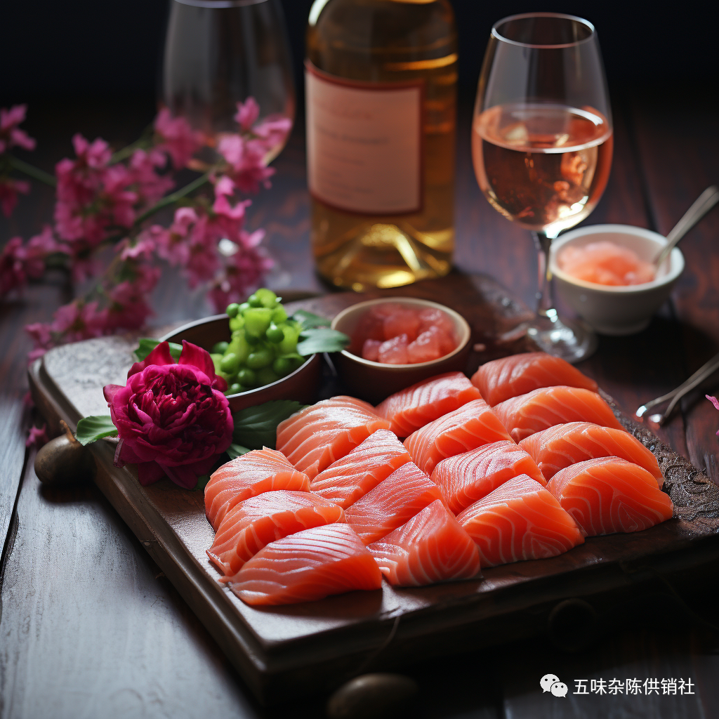 三文鱼刺身:搭配建议桃红葡萄酒(Rosé),桃红葡萄酒的果味和清新口感与三文鱼的丰富口感和鲜美肉质相得益彰。