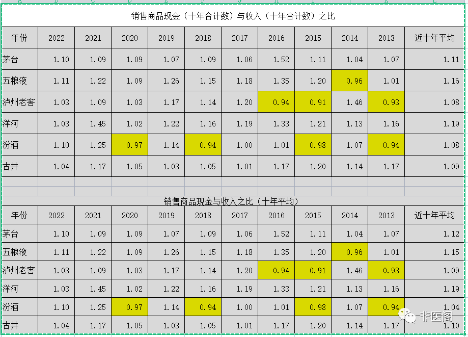 因昨天文章中的销售商品现金与收入之比,采用的是近十年合计的销售商品现金与近十年合计的营业总收入之比,昨夜忽然想到这样,可能会有一点误差,今天特地补充十年的比率合计再除以10来计算,也就是上图表中的下面一个表格中的数据。