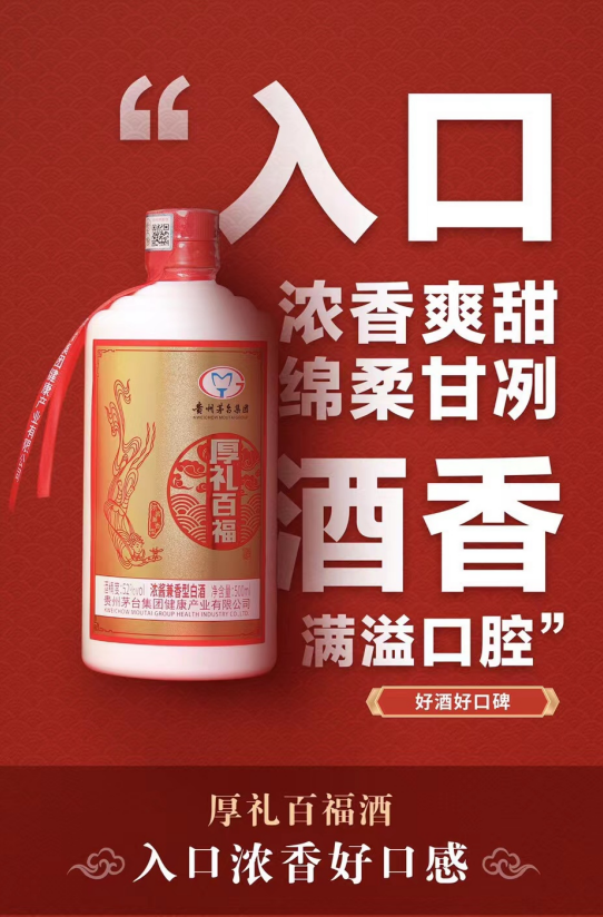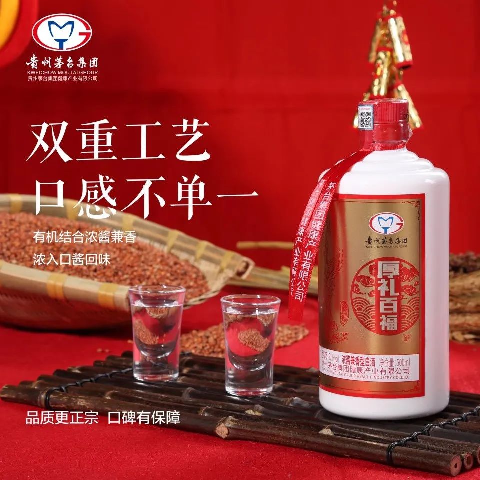 贵州茅台集团厚礼百福酒为浓酱兼香型白酒,取酱香之雅,浓香之烈。一杯浓酱兼香在手,享受两种香型,口感舒适,浓酱协调,浑然一体。兼容满足南北方人的饮酒需求和口味:既有酱酒的幽雅细腻,又有浓香酒的回甜爽净。