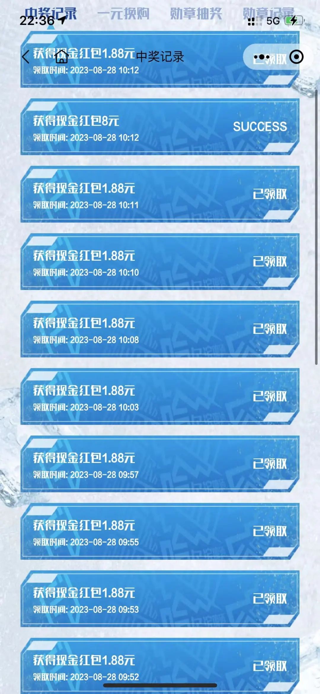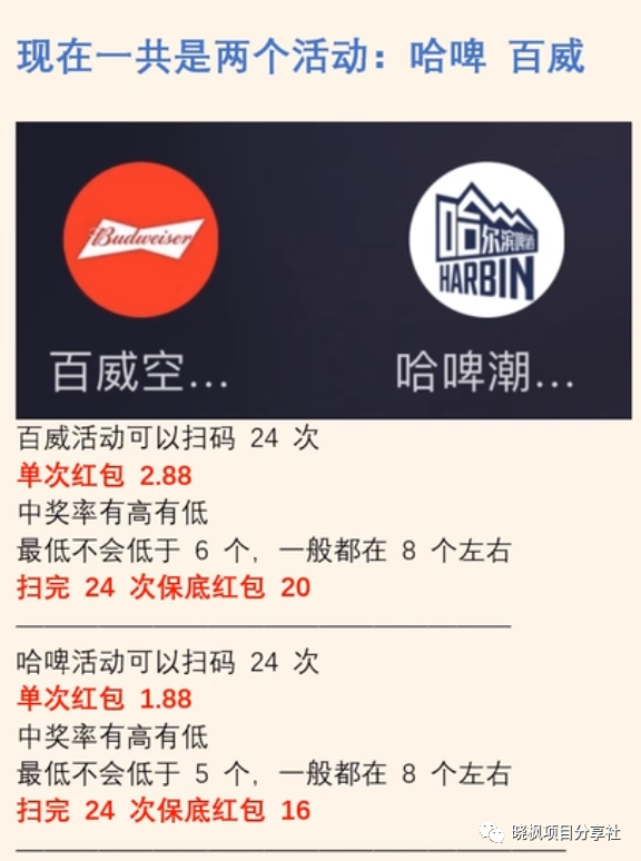 下面就给大家展示一下我们自己操作的成果。百威活动,可扫码24次,单次红包2.88元,中奖率时高时低,但最低不会低于6个,一般在8个左右。扫完24次保底红包20元;哈啤活动,也可扫码24次,单次红包1.88元,中奖率同样有高有低,最低不会低于5个,一般在8个左右。扫完24次保底红包16元。算一下,一个微信号一天可以扫48次,单个微信号的利润高达20-50元!扣掉购买瓶盖的费用,纯利润至少在20-50元/微信/天!微信号越多,赚的越多!而且活动持续到年底哦!